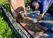 Приехав на кладбище, первым делом мы удалили кустарник, закрывающий памятник. Затем тщательно подмели цветник и территорию участка, после чего вытерли надгробье.